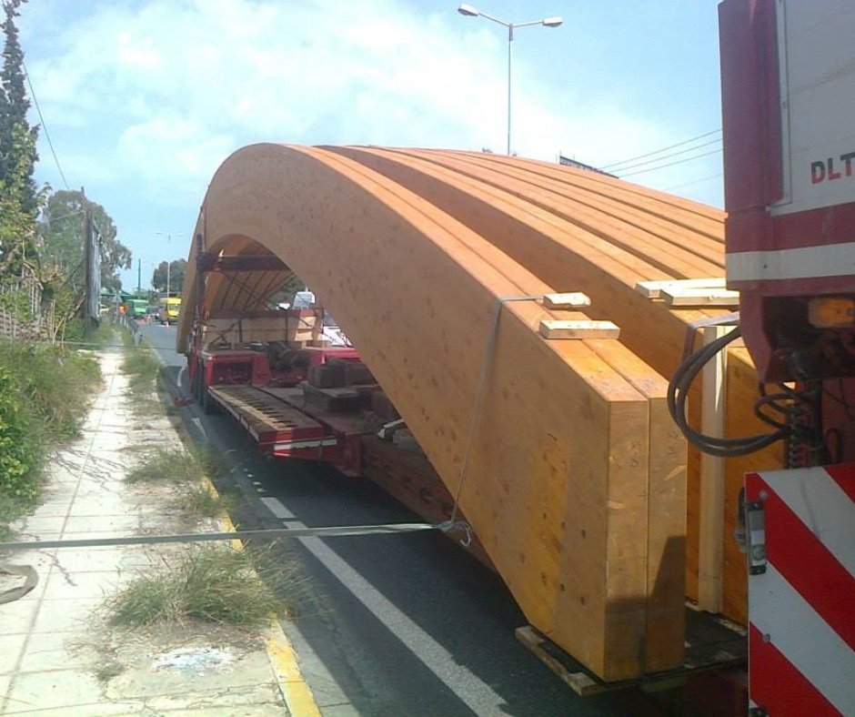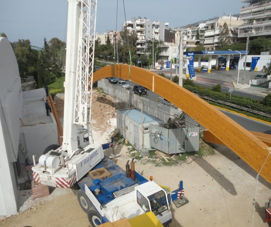 Χρήση γερανοφόρων οχημάτων για την ανέγερση του φορέα της στέγης.