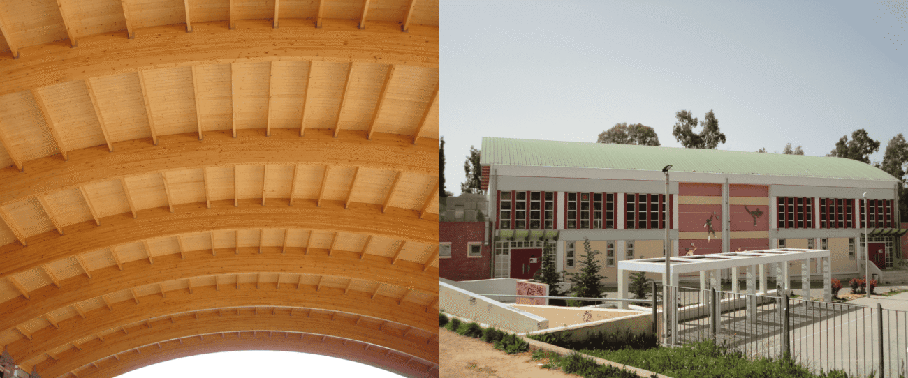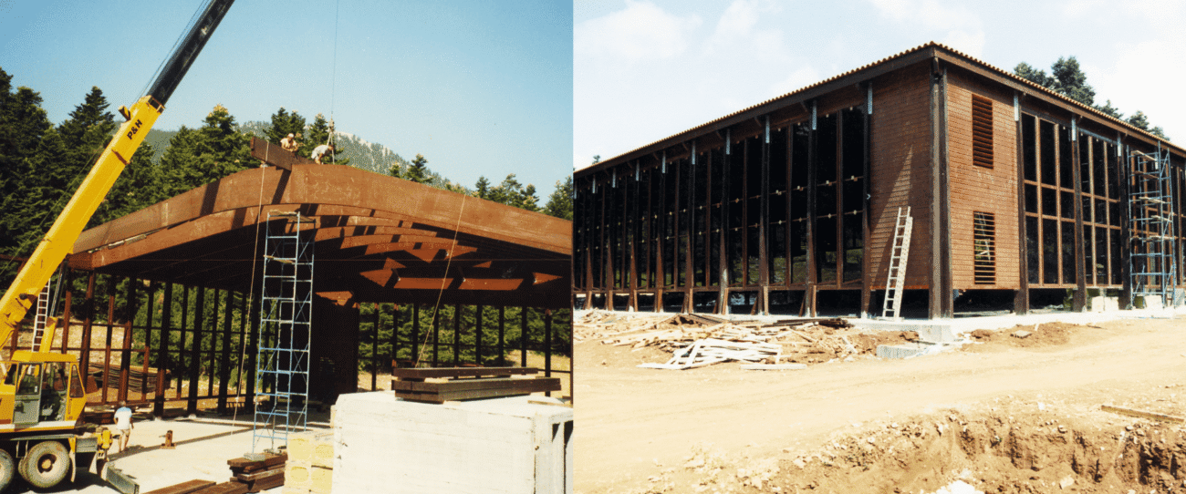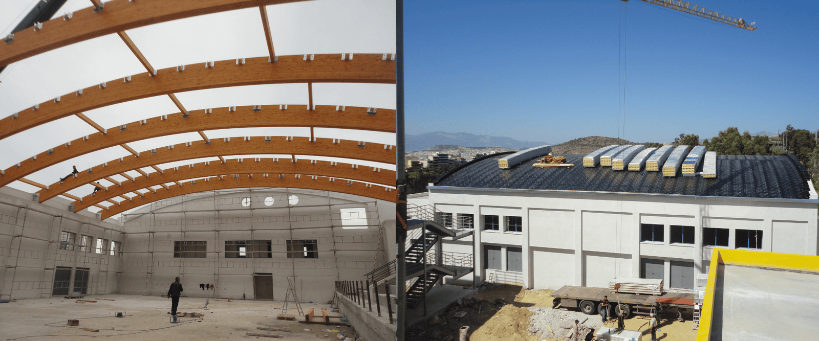 Μελέτη και κατασκευή ξύλινων στεγών μεγάλων ανοιγμάτων από επικολλητή ξυλεία (Glulam), εξασφαλίζοντας μέγιστη ασφάλεια, εξαιρετική ακουστική και κορυφαία αισθητική.